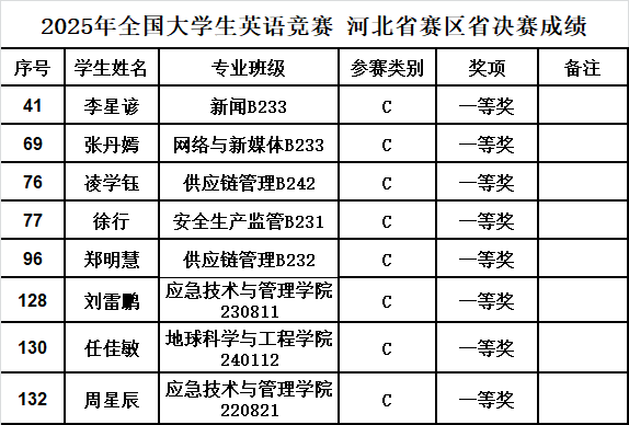 5月23日,2025年全国大学生英语竞赛(河北赛区)决赛成绩公布。我校8名选手在决赛中表现出色,均获得一等奖,此外44名学生荣获二等奖,73名学生荣获三等奖。